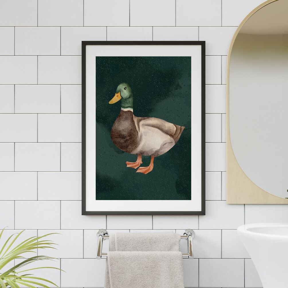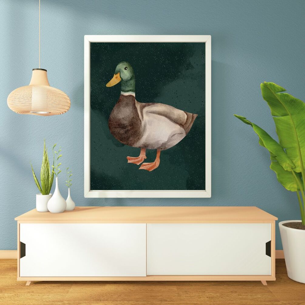 Immerse your space in the serene charm of our "Quacktastic Oasis" duck wall art. Against a lush green background, a vibrant tableau of whimsical ducks unfolds, capturing the essence of nature's beauty. The rich, verdant backdrop serves as a tranquil canvas for the playful ducks, each rendered in vivid hues of gold, orange, and white.